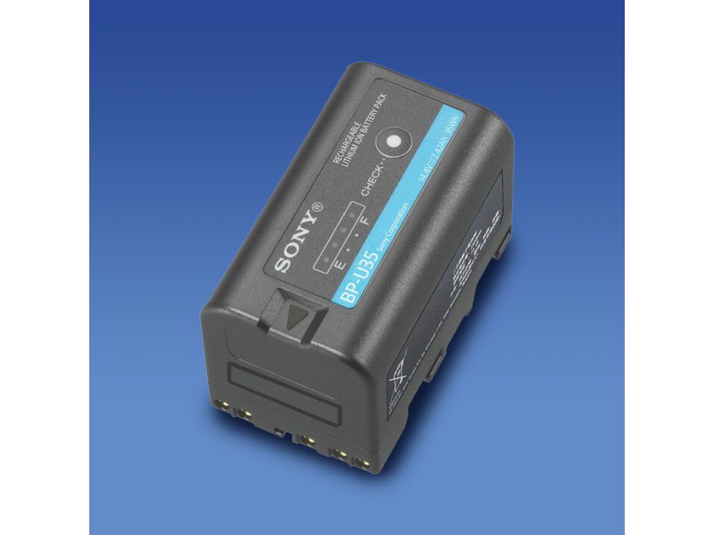 Sony BP-U35 je vysoce výkonný 35Wh lithium-iontový akumulátor kompatibilní s vybranými profesionálními videokamerami Sony. Údaje o stavu baterie jsou nepřetržitě předávány kameře. Zbývající kapacita se zobrazuje na LCD displeji kamery a v hledáčku, což uživatelům umožňuje snadno a přesně sledovat stav baterie během natáčení. Akumulátor lze dobít přibližně za 90 minut pomocí volitelné nabíječky BC-U1A/U2A. 4-LED indikátor zobrazuje zbývající kapacitu po 20, 40, 60 a 80 %.
